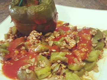 **Based on ½ cup tomato soup mixed in with ingredients, not soup peppers are baked in