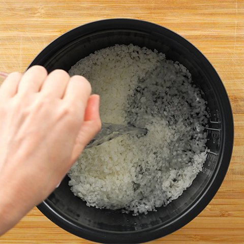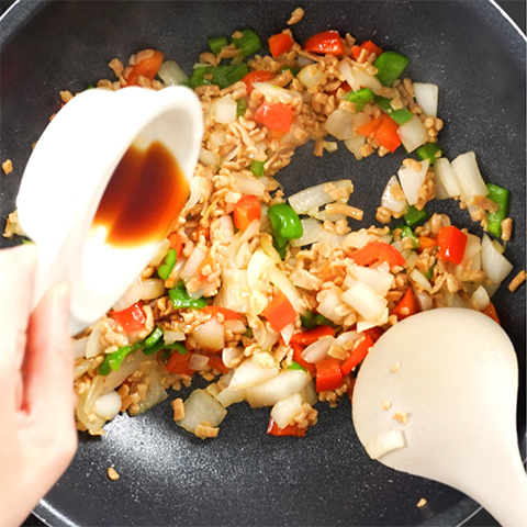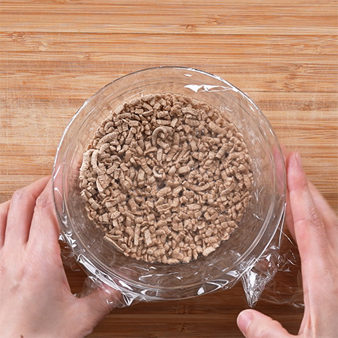低たんぱくミートにパッケージの記載通り水(分量外)を加え、電子レンジで加熱し、ラップをしたまま5分ほど蒸らす。