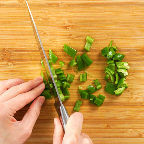 玉ねぎ、ピーマン、パプリカは小さめの角切りにする。にんにくはみじん切りにする。