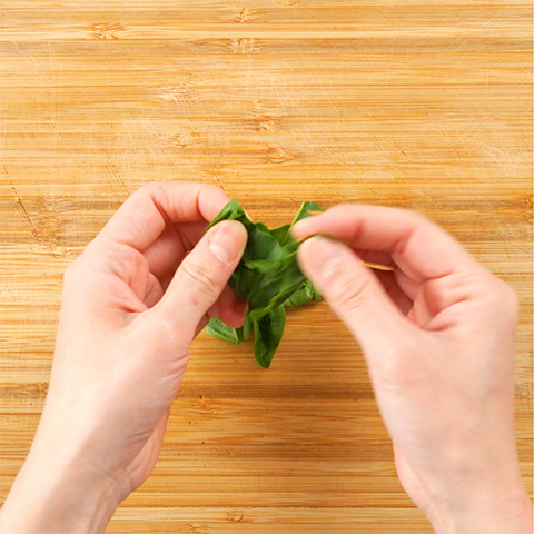 バジルは飾り用の4枚をとっておき、残りは適当な大きさにちぎる。