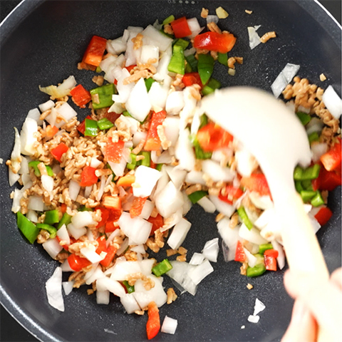 フライパンに●油を入れ、Step2、Step3のにんにくを入れて炒める。香りが立ったら玉ねぎ、ピーマン、パプリカも加えて火が通るまで炒める。