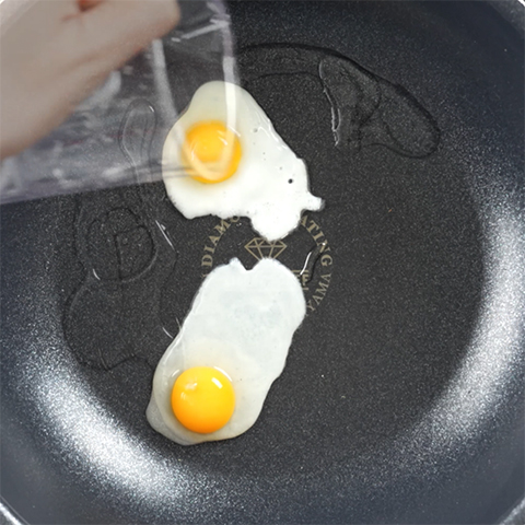 フライパンに〇油を入れ、うずらの卵を割り入れる。少量の水(分量外)を入れて蓋をし、目玉焼きを作る。