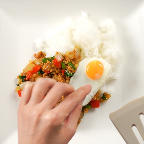 炊きあがったご飯を皿に盛り、Step5・Step6をのせ、飾り用のバジルを添える。