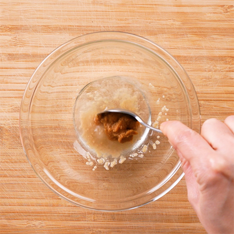 低たんぱくミートにパッケージの記載通り水(分量外)を加え、電子レンジで加熱し、ラップをしたまま5分ほど蒸らす。