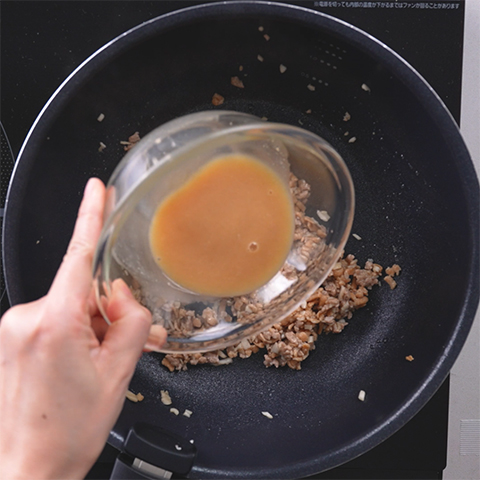 フライパンにごま油をひいて中火で熱し、ひき肉と低タンパクミートを炒める。色が変わったらStep1の舞茸としょうがを加えてさらに炒める。