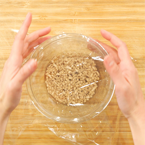 低たんぱくミートにパッケージの記載通り水(分量外)を加え、電子レンジで加熱し、ラップをしたまま5分ほど蒸らす。