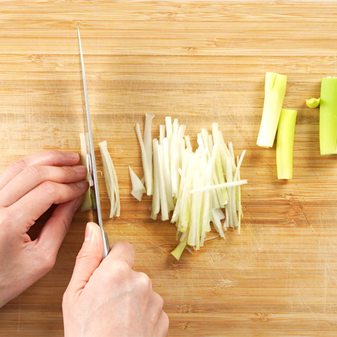 ねぎは5cm程の長さに切り白髪ねぎにする。芯の部分も千切りにする。