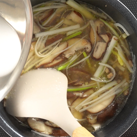 Step4に水を加えて沸かし、食材が煮えたらしょうゆ、塩、Step3を入れる。