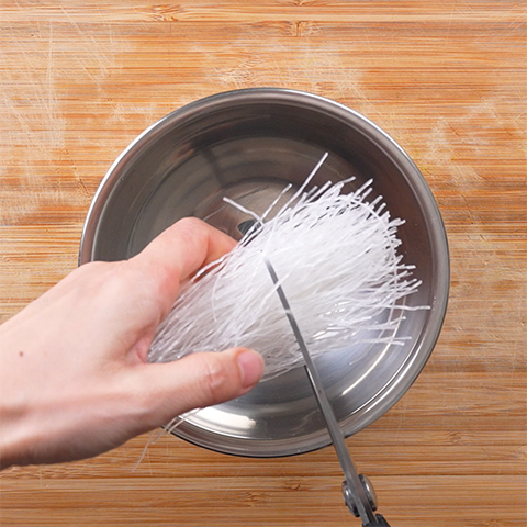 春雨ははさみでざく切りにし、熱湯に浸して戻しザルに上げておく。