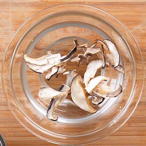 干し椎茸は水に浸して戻し、戻し汁はとっておく。