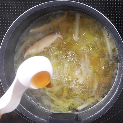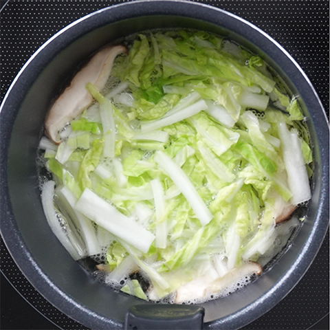鍋に椎茸の戻し汁と水(分量外)を合わせて400mlにし、Step2の白菜、Step3の椎茸を入れて煮立たせる。